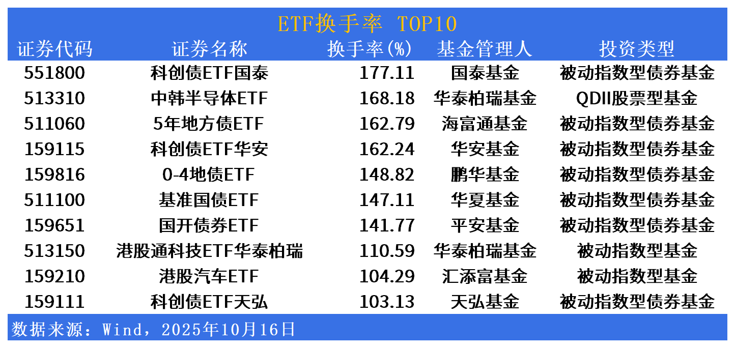 换手率方面,科创债ETF国泰(551800)换手率居首,达177%。中韩半导体ETF(513310)、5年地方债ETF(511060)、科创债ETF华安(159115)换手率居前。
