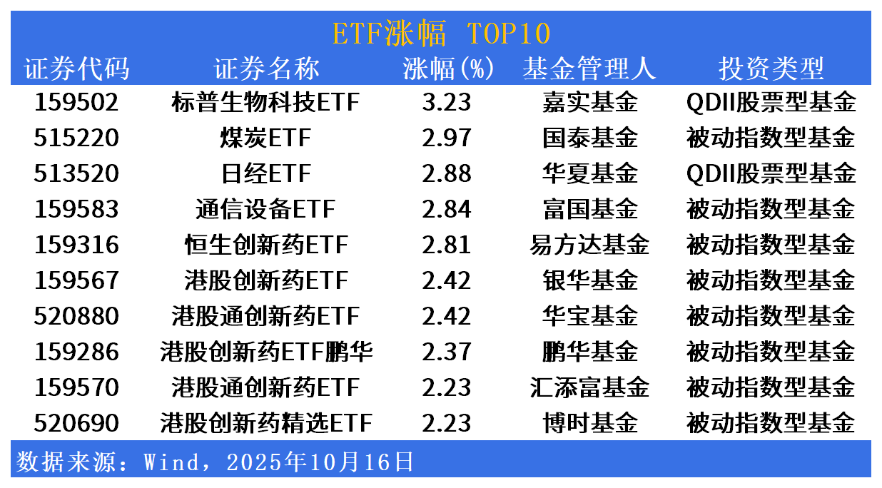 具体来看,标普生物科技ETF(159502)领涨超3%,煤炭ETF(515220)、日经ETF(513520)、通信设备ETF(159583)跟涨。恒生创新药ETF(159316)、港股创新药ETF(159567)、港股通床新药ETF(520880)、港股创新药ETF鹏华(159286)、港股通创新药ETF(159570)、港股创新药精选ETF(520690)涨幅居前。