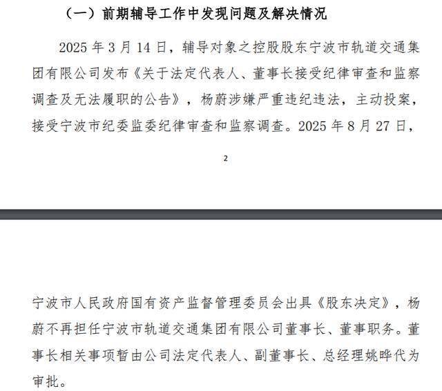 2025年8月27日,宁波市人民政府国有资产监督管理委员会出具《股东决定》,杨蔚不再担任宁波市轨道交通集团有限公司董事长、董事职务。董事长相关事项暂由公司法定代表人、副董事长、总经理姚晔代为审批。