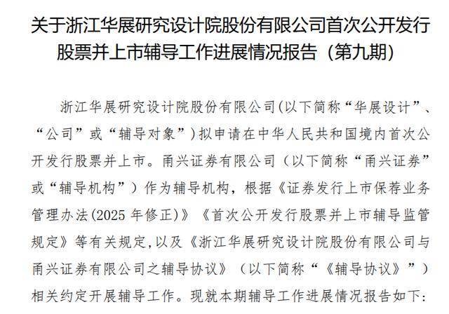 瑞财经 王敏 10月16日,浙江华展研究设计院股份有限公司(以下简称“华展设计”)发布关于首次公开发行股票并上市辅导工作进展报告(第九期),辅导机构为甬兴证券。