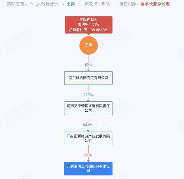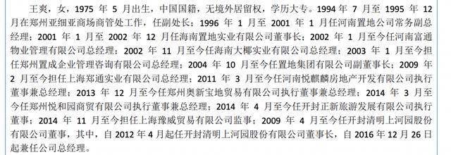 公开资料显示,王爽,女,1975年5月出生。历任郑州亚细亚商场商管处副处长,河南置地公司常务副总经理,海南置地实业有限公司董事长,河南富通物业管理有限公司总经理,海南大椰实业有限公司总经理,郑州置成企业管理咨询有限公司总经理,置地集团有限公司副董事长,上海郑通实业有限公司总经理,河南悦麒麟房地产开发有限公司执行董事兼总经理,郑州奥新宝地贸易有限公司执行董事兼总经理,任郑州悦和园商贸有限公司执行董事兼总经理,封正新旅游发展有限公司执行董事,上海豫威贸易有限公司监事。2009年4月任开封清明上河园股份有限公司董事,其中,自2012年4月起任开封清明上河园股份有限公司董事长,自2016年12月26日起兼任公司总经理。