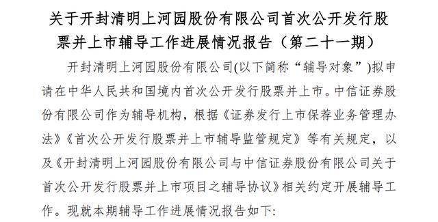 瑞财经 刘治颖 近日,开封清明上河园股份有限公司(以下简称:清园股份)发布关于首次公开发行股票并上市辅导工作进展情况报告(第二十一期),中信证券为辅导机构。