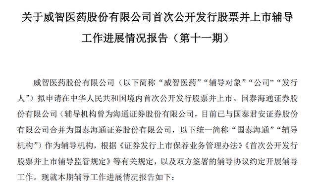 瑞财经 刘治颖 近日,威智医药股份有限公司(以下简称:威智医药)发布关于首次公开发行股票并上市辅导工作进展情况报告(第十一期),国泰海通为辅导机构。