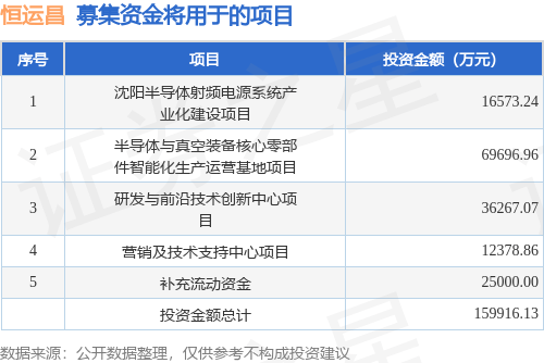 证券之星消息,深圳市恒运昌真空技术股份有限公司(简称:恒运昌)拟在上交所科创板上市,募资总金额为15.5亿元,保荐机构为中信证券股份有限公司。募集资金拟用于沈阳半导体射频电源系统产业化建设项目、半导体与真空装备核心零部件智能化生产运营基地项目、研发与前沿技术创新中心项目、营销及技术支持中心项目、补充流动资金,详见下表: