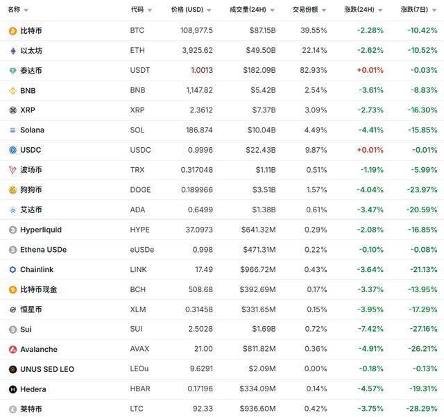 刚刚过去的24小时内,加密货币集体跳水,比特币一度从11.15万美元跌至10.75万美元,盘中跌幅一度超过3.5%。以太坊盘中也一度跳水超5%,BNB、Solana等纷纷跟跌。截至记者发稿时,比特币、以太坊、XRP跌超2%,BNB、艾达币跌3%,Solana跌超4%。