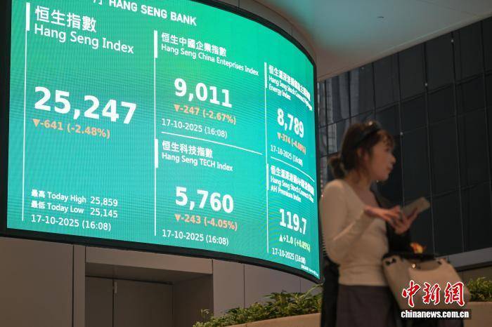 10月17日,香港恒生指数跌641.41点,跌幅2.48%,收报25247.1点。全日主板成交3146.24亿港元。 中新社记者 陈永诺 摄