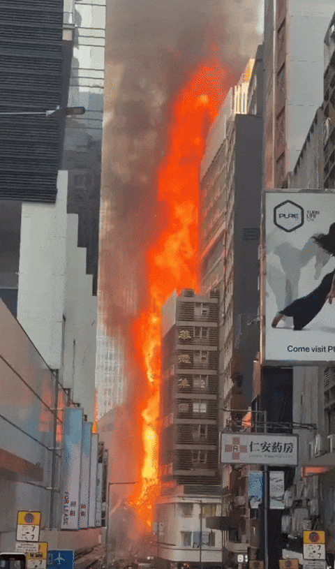 今天(18日)下午4点左右,香港中环干诺道中34-37号华懋大厦后巷,一大楼外棚架起火,火乘风势直攻而上,大厦陷入火海,浓烟席卷半空,一度传出爆炸声。