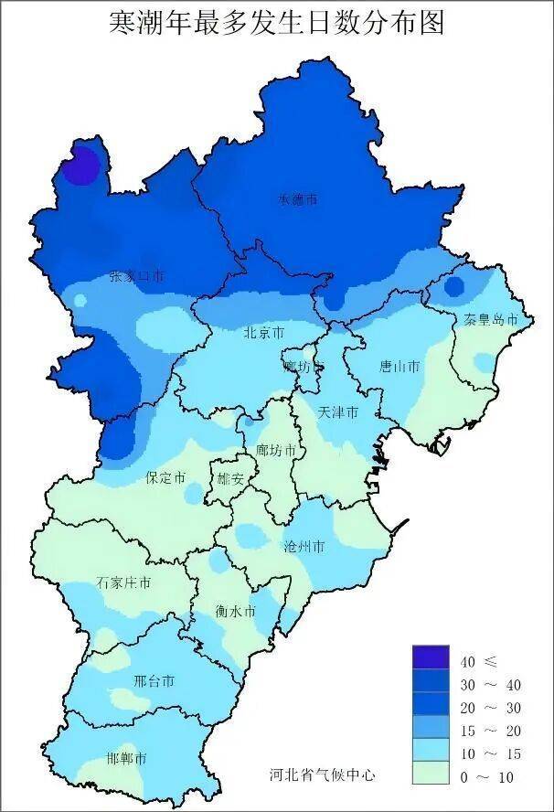 河北省寒潮发生日数呈现由北向南递减的分布。张承大部常年平均寒潮日数超过6天,张家口北部和西南部、承德中北部超过10天;中南部大部分地区在2-4天,石家庄市大部分地区寒潮日数不足2天。从建站以来各地区年最多寒潮发生日数分布看,张承大部年最多寒潮日数超过20天,康保年寒潮日数最多达46天。