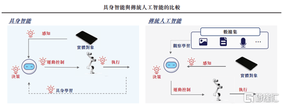 与传统的编程机器人不同,具身智能系统通过与现实世界的互动进行学习,就能灵活适应环境条件,并能在两个或多个任务之间无缝切换及协同执行,无需依赖预先编程或大量标注数据。