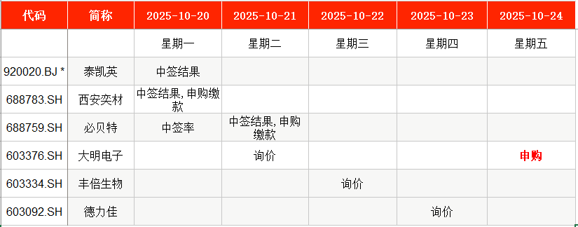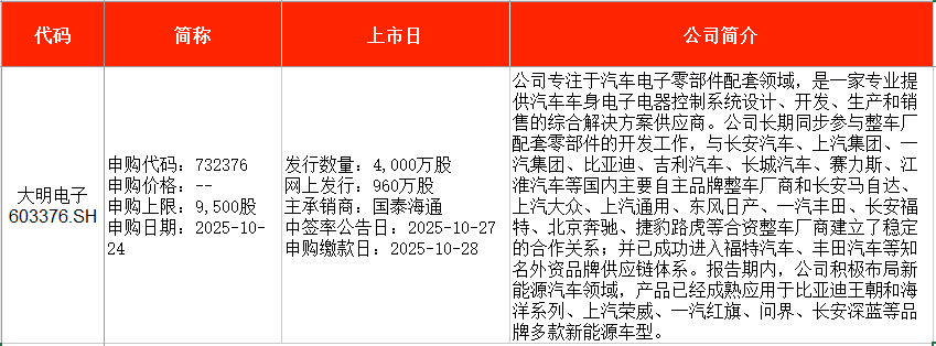 从时间表看,大明电子(603376)将在本周五(10月24日)申购。