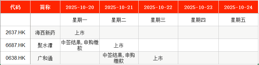 港股方面,Wind数据显示,本周(10月20日至10月24日)聚水潭(06687.HK)将在本周一申购缴款;广和通(00638.HK)将在本周二申购缴款。