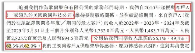 最新招股书显示,2025年一季度歌尔微来自一家领先的美国跨国科技公司(业界普遍认为是美国苹果公司)的销售收入占比高达62%,较2022年的56.1%不降反升。与此同时,全球MEMS传感器行业增速已放缓至个位数,歌尔微的业绩增长持续性存疑。