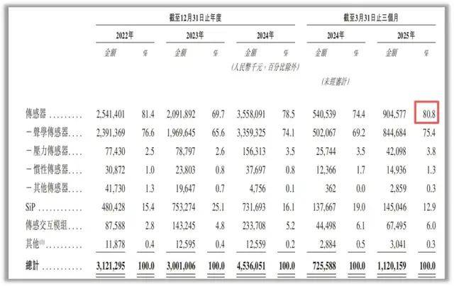 从业务角度来看,歌尔微的业务主要由传感器、SiP(系统集成封装)及传感交互模组三部分构成。其中,传感器业务占据绝对主导地位,2025年一季度营收占比高达80.8%。