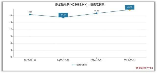 Wind数据显示,2022年-2024年,歌尔微毛利率分别为18.5%、17.2%、19.0%,长期低于20%,显著低于同行瑞声科技(2024年22.1%)和敏芯股份(2024年24.88%)。