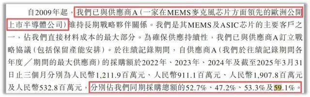 第一,公司高溢价芯片依赖外购。传感器芯片长期依赖供应商A(一家在MEMS麦克风芯片方面领先的欧洲公开上市半导体公司,外界广泛认为是英飞凌)等单一供应商,2025年一季度采购占比高达59.1%,这或许使得公司议价能力和成本控制受制约,导致原材料成本居高不下;