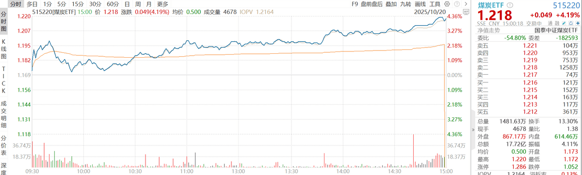 市场对红利板块关注度提升,煤炭行业具备高分红属性。截至10月20日,中证煤炭指数股息率4.82%,叠加科技板块估值较高、市场避险情绪升温,红利板块的吸引力再度提升。截至10月17日,近5个交易日煤炭ETF(515220)吸金5.9亿元。