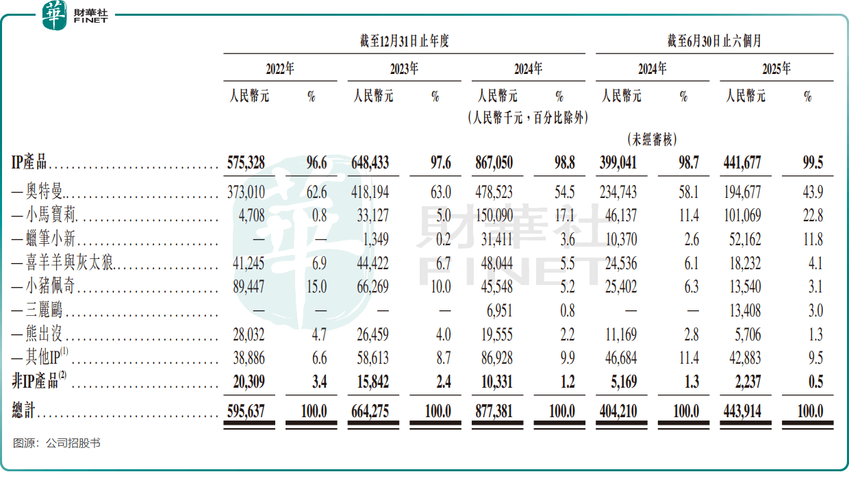 数据显示,2025年上半年,金添动漫有高达99.5%的收入来源于外部授权IP。其中,仅奥特曼、小马宝莉和蜡笔小新三大IP就贡献了近80%的收入,而公司自有品牌几乎未能形成规模支撑。