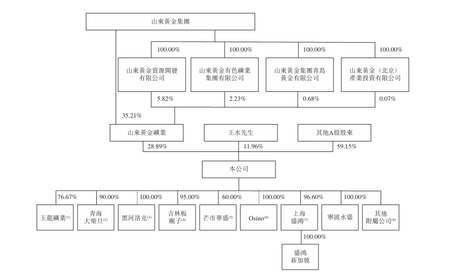 截至最后实际可行日期,山东黄金矿业持有公司约8.02亿股,持股比例约28.89%,为公司控股股东。此外,王水持有约3.32亿股,持股比例约11.96%;其他A股股东持股比例约为59.15%。