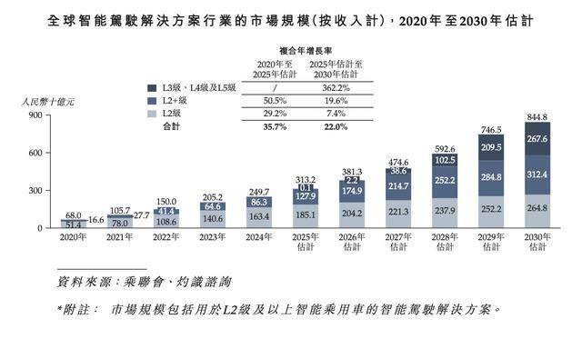受益于大规模AI模型在汽车行业的应用,全球智能驾驶解决方案市场规模预期于2025年将达到3,132亿元,至2030年进一步扩大至8,448亿元,期间复合年增长率为22.0%。