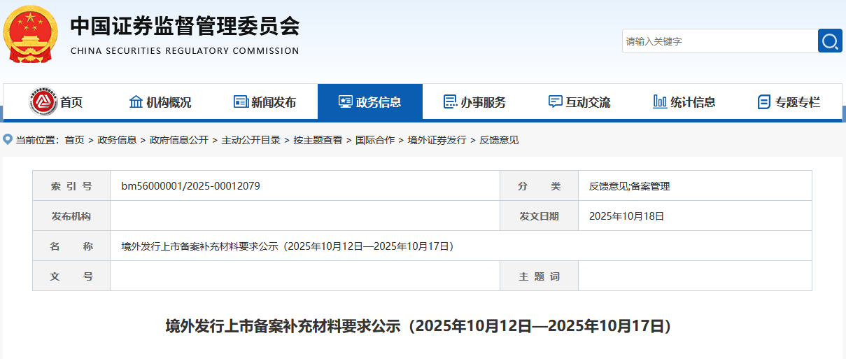 10月18日,中国证监会公布境外发行上市备案补充材料要求(2025年10月12日至2025年10月17日),其中提到,要求微脉补充说明员工持股平台设立情况及外汇登记程序履行情况等事项。