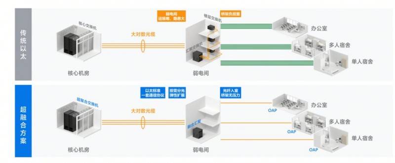 在架构层面,超融合方案依然保持极简以太彩光方案的整体特性,继承以太网架构的多重优势,且依然保持“核心-接入”的大二层架构,不需要单独再部署OLT、BRAS等设备,融合汇聚设备无需强电改造,管理更加简单。