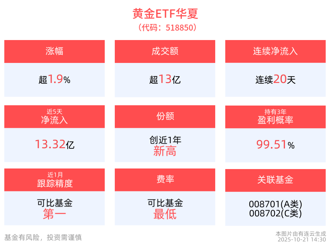 流动性方面,黄金ETF华夏盘中换手17.02%,成交13.98亿元,市场交投活跃。拉长时间看,截至10月20日,黄金ETF华夏近1周日均成交13.96亿元。