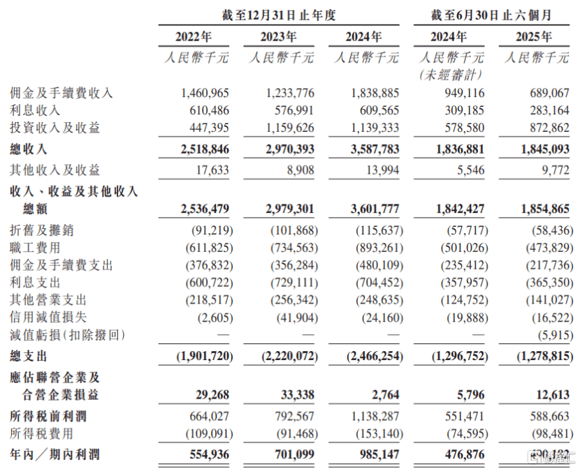 具体来看,2022年、2023年、2024年和2025年1-6月,首创证券的总收入分别约25.19亿元、29.7亿元、35.88亿元、18.45亿元,对应的净利润分别约5.55亿元、7.01亿元、9.85亿元、4.9亿元。