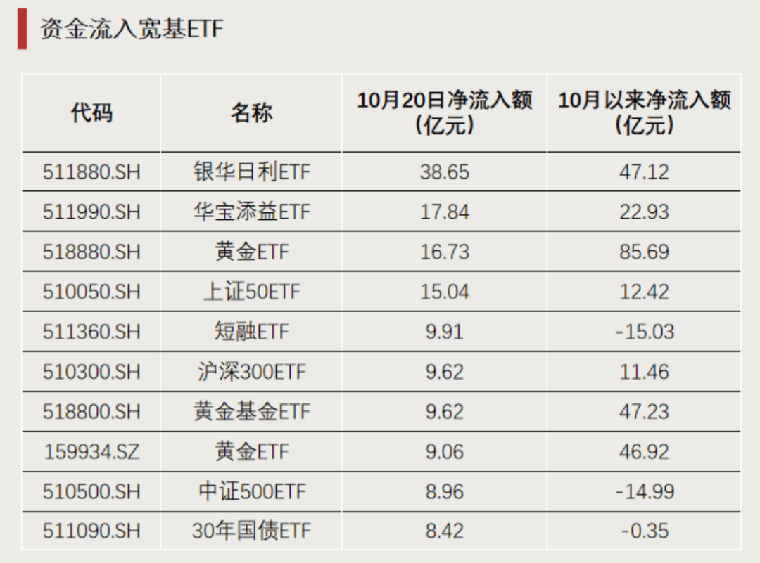 10月20日,部分宽基ETF获资金加码,多只黄金ETF继续“吸金”。