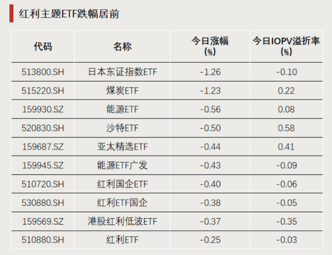 下跌方面,部分红利资产回调,煤炭股普跌,多只红利主题ETF跌幅居前。日本东证指数ETF(513800)、沙特ETF(520830)等跨境ETF也跌幅居前。