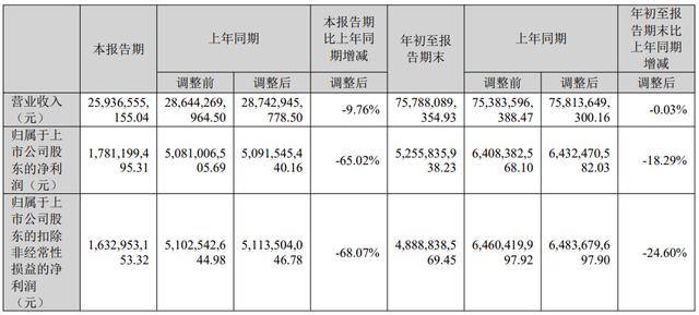 第三季度营业收入为259.37亿元,同比下降9.76%;归母净利润为17.81亿元,同比下降65.02%。