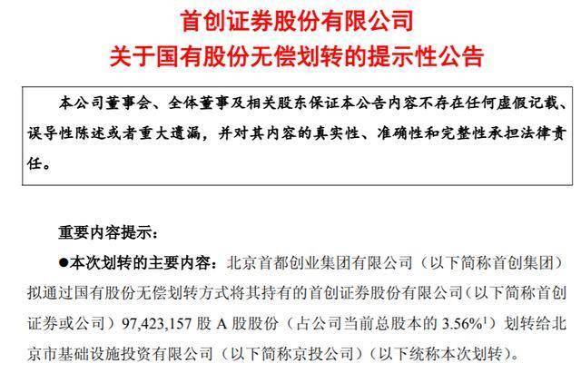 值得关注的是,就在递表前一日,首创证券还启动了国资股东体系内的股权划转:控股股东首创集团将所持3.56%股权无偿划转给第二大股东北京市基础设施投资有限公司(下称“京投公司”),二者同属北京市国资委控制。