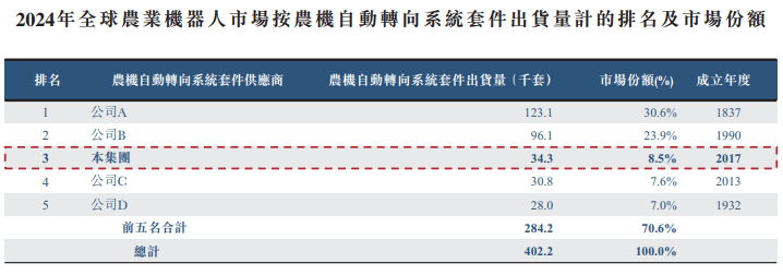 根据弗若斯特沙利文报告,当前农业机器人市场集中,前五名供货商占全球农机自动转向系统套件出货量约70.6%,前五名供货商占全球改装农机自动转向系统套件出货量约74.8%。