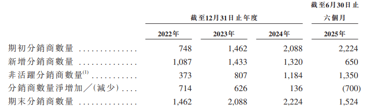 招股书显示,丰疆智能的非活跃分销商持续增加,报告期内从373家增至807家、1184家、1350家,占当期期末分销商总数的比重分别是25.51%、38.65%、53.24%、88.58%。而截至2025年6月30日,公司的分销商减少至1524家,较上年同期减少700家,同比降低31.47%。界面新闻了解到,该公司一般不会与分销商订立为期超过一年的长期合约。