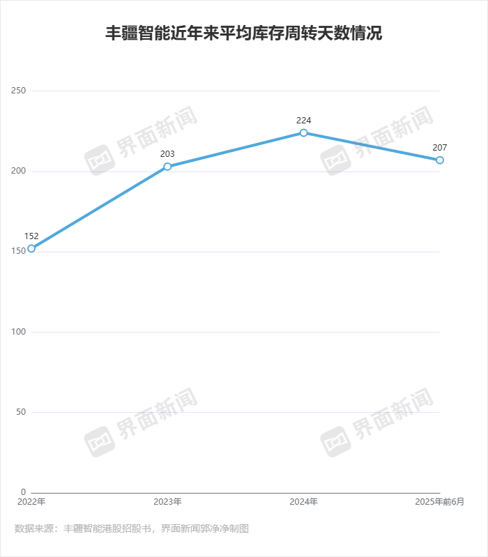 在海外扩张加快的同时,丰疆智能的库存持续增加。2022年至2024年及2025年上半年,丰疆智能的库存分别为1.4亿元、1.34亿元、1.15亿元及1.62亿元,平均库存周转天数分别为152天、203天、224天及207天。截至2025年8月31日,公司截至2025年6月30日的存货已售出或使用2820万元,占比17.1%。