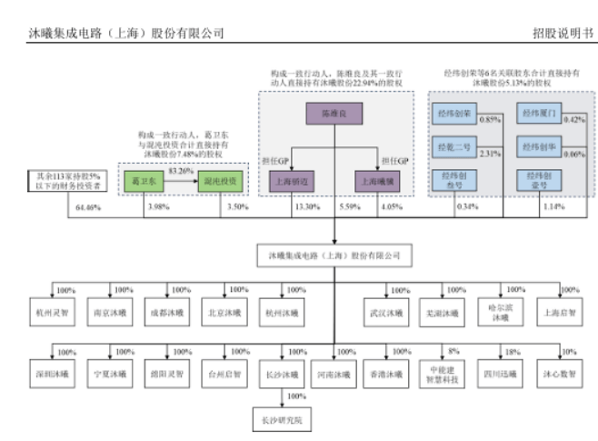 截止目前,沐曦股份共有124名股东,持股在5%以下的投资者共113位,属于财务投资者,共计持有沐曦股份64.45%的股份。葛卫东与混沌投资为一致行动人,合计持有沐曦股份7.48%的股份。经乾二号、经纬创壹号、经纬创荣、经纬厦门、经纬创叁号与经纬创华分别持有沐曦股份2.31%、1.14%、0.85%、0.42%、0.34%与0.06%股份,以上股东具有关联关系,共计持有沐曦股份5.13%的股份。