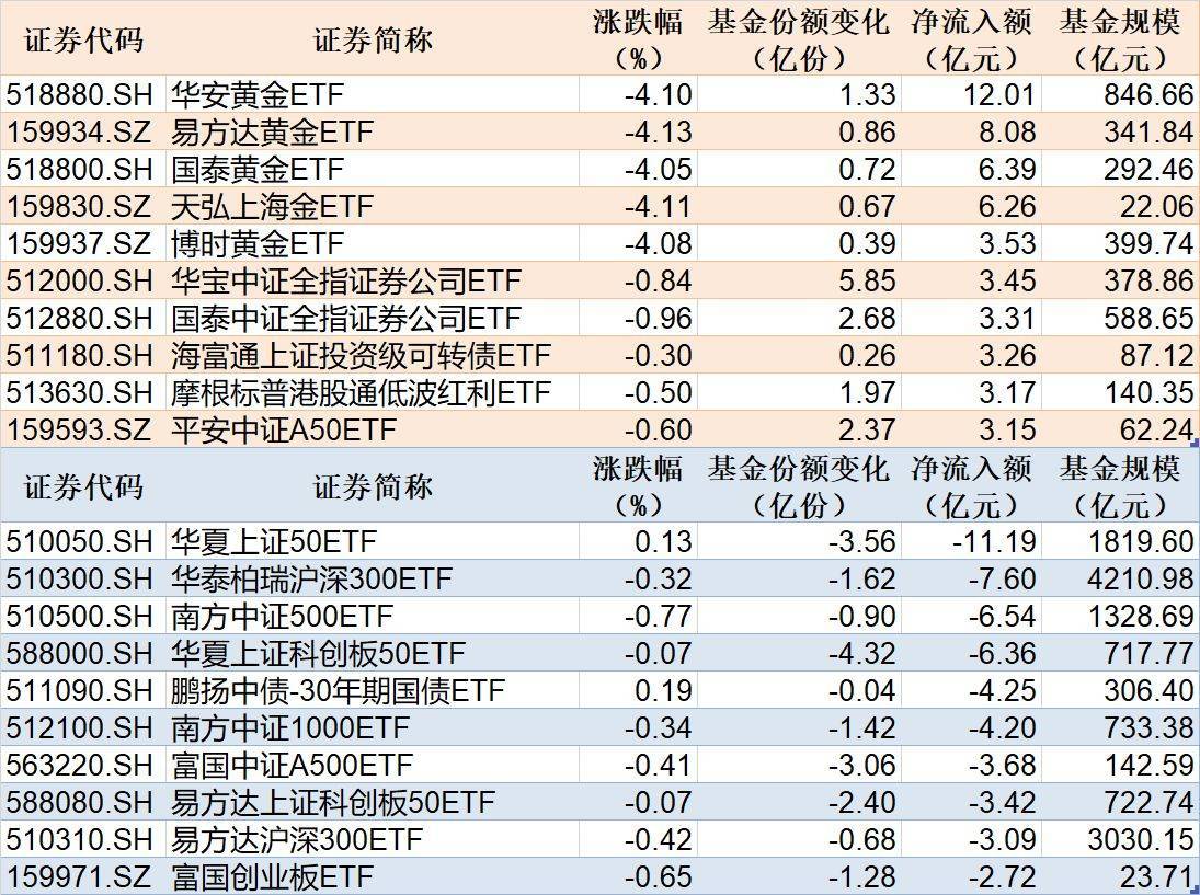 与此同时,华夏上证50ETF基金份额减少3.56亿份,净流出额为11.19亿元;华泰柏瑞沪深300ETF基金份额减少1.62亿份,净流出额为7.60亿元;南方中证500ETF基金份额减少0.90亿份,净流出额为6.54亿元。