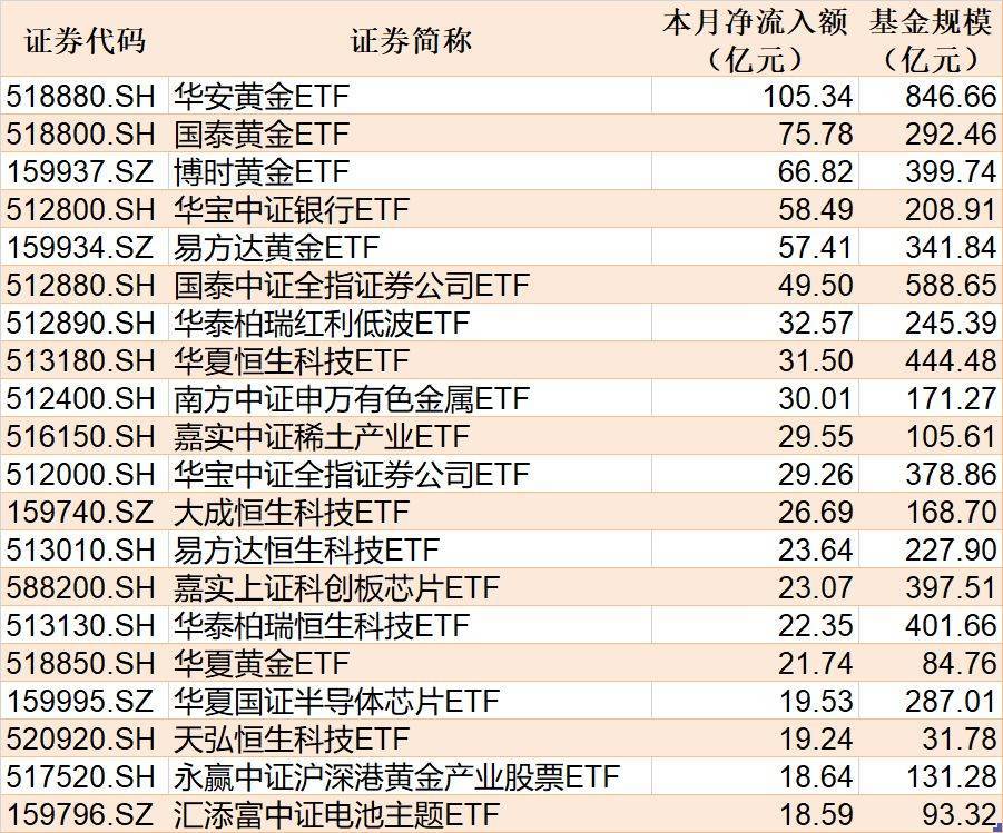 截至10月22日,本月资金净流入额居前20的ETF名单如下: