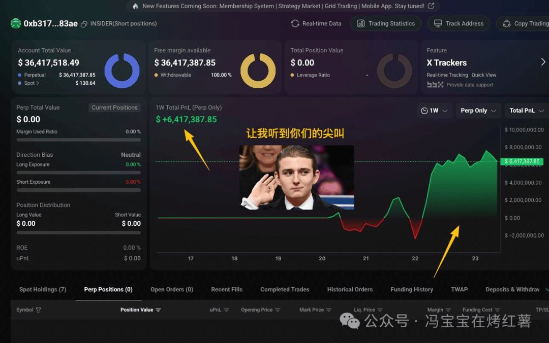 网传:Barron的白宫内幕钱包,今天早上刚刚终于平掉了所有的空单进入胜利结算界面,过去一周通过大空单盈利640万。