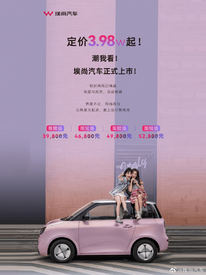 近日,全新新能源汽车品牌“埃尚”正式发布,旗下首款车型A100C也同步上市,定位微型纯电小车,官方指导价为3.98万元~5.28万元。