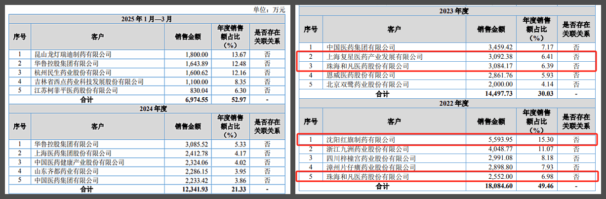 记者注意到,近三年多,公司前五大客户更迭显著。2022年首位客户沈阳红旗制药销售额5594万元,2023年已跌出前五;珠海和凡从2022年的第五位滑落,至2024年已悄然消失。2023年尚列次席的上海复星医药,亦在2024年前五名单中失去身影。