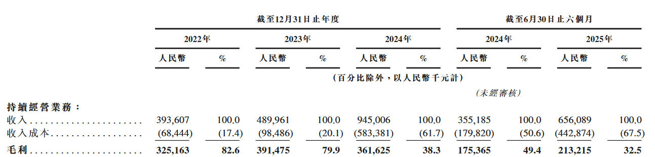 营收规模上,2022年至2024年及2025年上半年,公司分别实现收入3.94亿元、4.90亿元、9.45亿元和6.56亿元,同比增长分别为24.5%、90.2%和84.8%。值得注意的是,2024年前三季度营收已达6.43亿元,超过2023年全年营收水平,显示出业务转型后的强劲增长势头 。