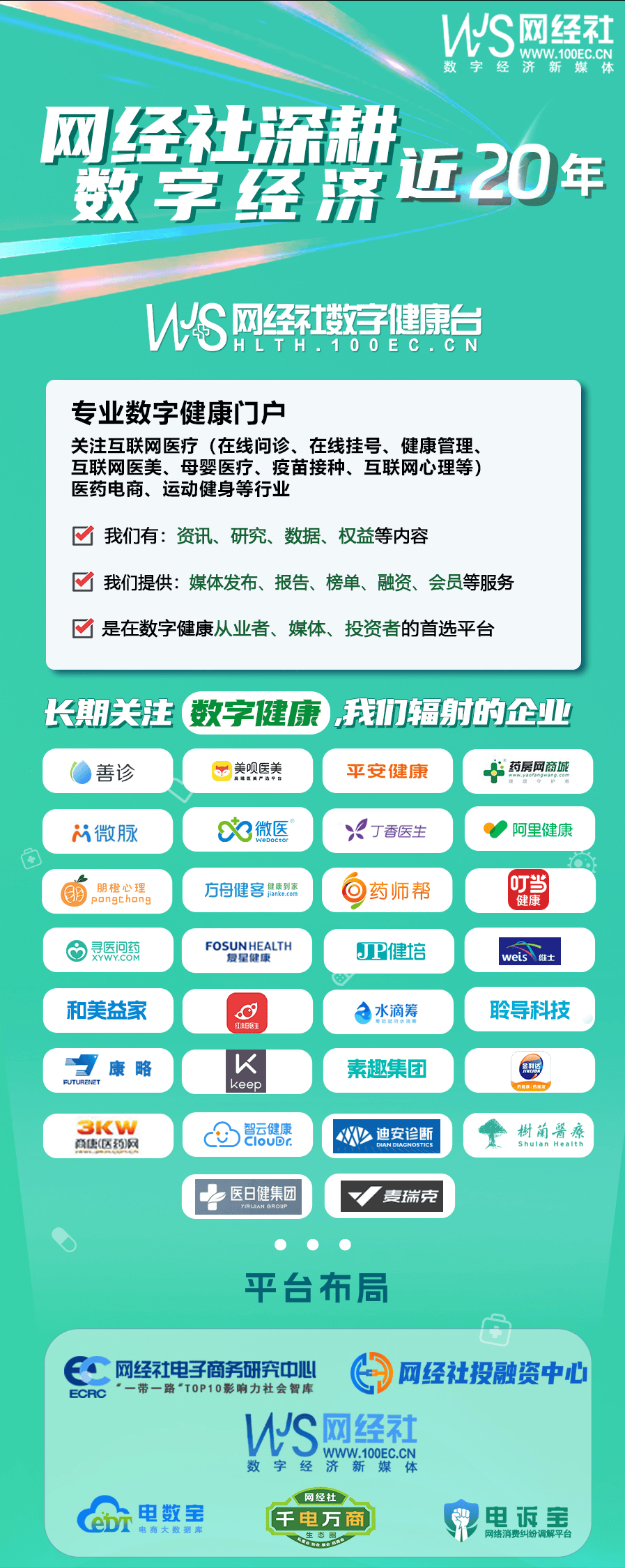 网经社数字健康台是专业数字健康门户,重点关注在线问诊、健康管理、互联网医美、互联网心理、医药电商、运动健身等行业。有资讯、数据、研究、权益等内容,提供媒体发布、报告榜单、融资、会员、售后顾问、供应链金融等。