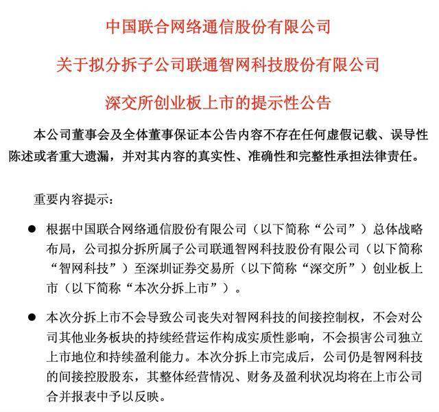 与此同时,中国联通宣布,拟分拆所属子公司联通智网科技股份有限公司(以下简称“智网科技”)至深交所创业板上市。