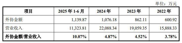 数据显示,报告期各期(2022年~2025年上半年),公司外协金额占营业收入的比例分别为3.78%、4.52%、4.87%和10.07%,呈现上升趋势。