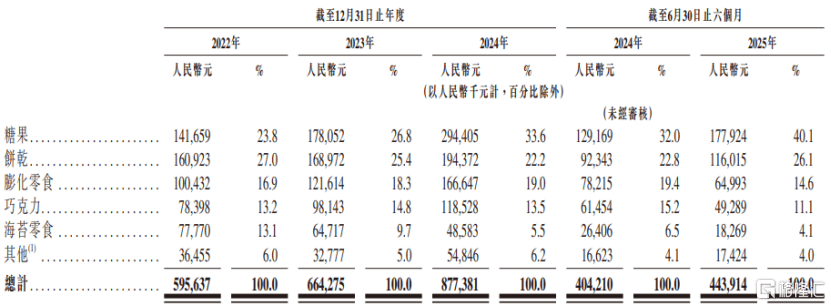 具体来看,2022年至2025年上半年(简称“报告期”),公司来自糖果的收入占比从23.8%提升至40.1%,饼干的收入占比超过20%,膨化零食、巧克力的收入占比均超过10%。