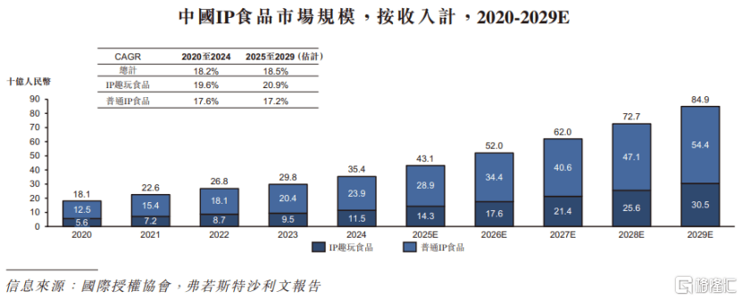 其中,IP趣玩食品同时满足了消费者“吃”和“玩”的情绪价值,2024年市场规模为115亿元,预计到2029年IP趣玩食品市场将达到305亿元,2025年至2029年的复合年增长率为20.9%。