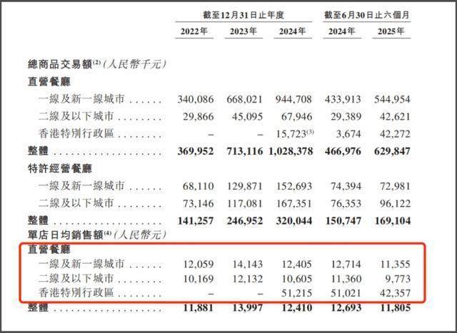 值得注意的是,2025年上半年,遇见小面直营餐厅一线及新一线城市订单总数约为0.18亿单,同比增长38.46%;但2025年上半年遇见小面直营门店单店日均销售额约为1.12万元,较2024年同期的1.24万元,反而减少了约11.02%。