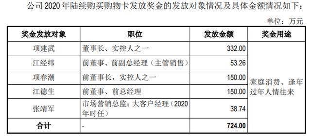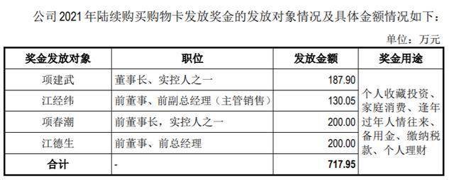 根据问询函,2020年及2021年,通领科技通过购物卡方式给相关管理人员发放奖金分别为724万元、717.95万元,合计1442万元。其中,董事长项建武发放购物卡金额总计519.9万元。