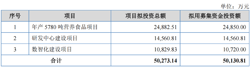 招股书显示,此次IPO,衡美健康计划募集资金5.01亿元,其中2.49亿元用于年产5780吨营养食品项目,1.46亿元用于研发中建设项目,1.07亿元用于数智化建设项目。