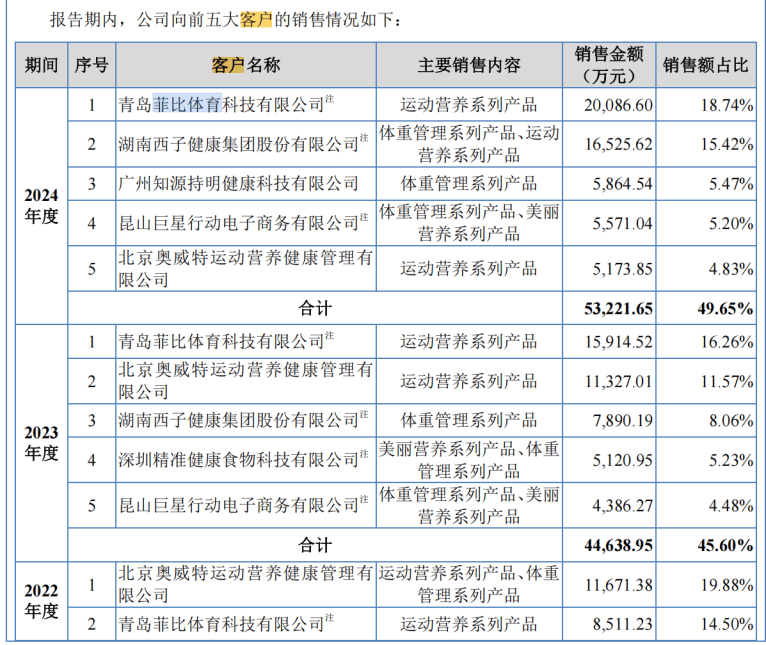 报告期内,青岛菲比体育科技有限公司分别为衡美健康的第二大、第一大、第二大客户,销售金额分别为8511.23万元、15914.52万元和20086.6万元,占当期销售总额的比例分别为14.5%、16.26%和18.74%,不论金额还是占比都持呈续增长势头。